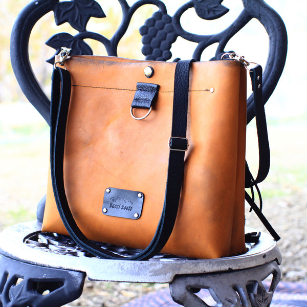 Medium tote, distressed cognac with black accents including scrolled pocket and fringe.